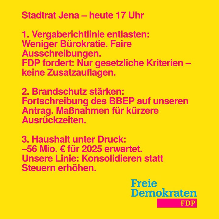 Stadtrat Jena – heute ab 17 Uhr Heute stehen mehrere für Jena wichtige Themen auf der Tagesordnung. 1. Antrag der FDP-Fraktion: Vergaberichtlinie entbürokratisieren Wir bringen einen Antrag zur Überprüfung und Anpassung der städtischen Vergaberichtlinie ein. Bei städtischen Ausschreibungen bewerben sich immer weniger Unternehmen, weil wir die Vergaben in den vergangenen Jahren mit zahlreichen fachfremden Kriterien überfrachtet haben. Darunter leiden vor allem kleine und mittelständische Betriebe, die die steigenden Dokumentationspflichten kaum noch leisten können. Unsere Forderung ist klar: ► Alle fachfremden Kriterien streichen. ► Nur verlangen, was auch gesetzlich vorgeschrieben ist. So schaffen wir wieder fairen Wettbewerb und stärken den regionalen Mittelstand. 2. Fortschreibung des Brandschutzbedarfs- und Entwicklungsplans (BBEP) Auf Antrag der FDP (gemeinsam mit der CDU) wurde der BBEP fortgeschrieben und ein externer Gutachter beauftragt. Ein Schwerpunkt war die Verbesserung der Feuerwache Süd, damit die vorgeschriebenen Ausrückzeiten künftig zuverlässig eingehalten werden können. Die Fortschreibung enthält eine Reihe konkreter Maßnahmen, die nun zeitnah umgesetzt werden sollen. 3. Oberbürgermeisterbericht – Haushalt in der Schieflage Der Zentrale Steuerungsbericht zum 31.08.2025 zeigt deutlich: Der städtische Haushalt gerät weiter unter Druck. Für 2025 wird ein negatives Jahresergebnis von 56 Mio. Euro erwartet. Die wesentlichen Gründe: • –25 Mio. € geringere Gewerbesteuereinnahmen • +12 Mio. € höhere Ausgaben für Pflichtaufgaben im sozialen Bereich • steigende Zuschüsse an die Stadtwerke wegen höherer Kosten im Nahverkehr und in den Bädern Die FDP-Fraktion fordert daher eine echte Haushaltskonsolidierung. Steuererhöhungen oder neue Schulden lösen strukturelle Probleme nicht – sie belasten nur die Bürger.